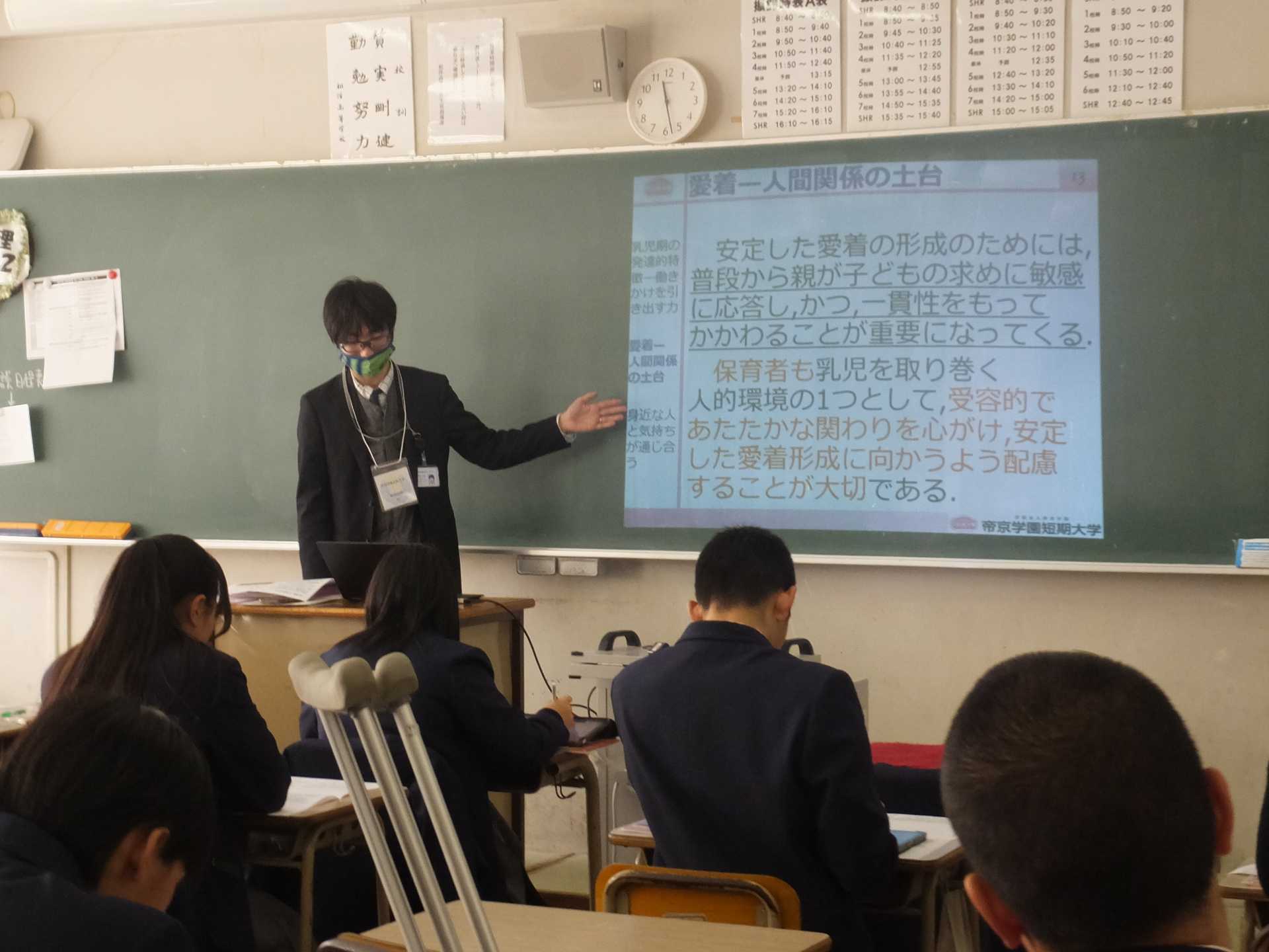 当日は、各大学の専門分野に基づく講義を中心に、大学での学びや進路の多様性について理解を深めました。東海大学 児童教育学部からは、絵本の読み聞かせをテーマに、子どもの発達や表現の工夫についての講義が行われました。日本大学 生物資源科学部 国際共生学科では、生物資源科学部に所属しながらも文系生徒の進学が可能な学科として、国際的な視点から社会課題に取り組む学びについて紹介がありました。産業能率大学の授業では、経営学をテーマに、社会や企業の仕組みについて分かりやすい講義が行われました。杉野服飾大学からは、服飾・デザイン分野の学びについての説明に加え、色鉛筆を用いたデザイン制作を通して、創造的な発想に触れる機会が提供されました。帝京学園短期大学 保育科の授業では、「赤ちゃんはなぜ可愛いのか?」をテーマに、心理や発達の観点から保育の専門性について講義が行われました。講師の星田先生は本校の卒業生であり、生徒たちにとって身近な進路モデルとなりました。