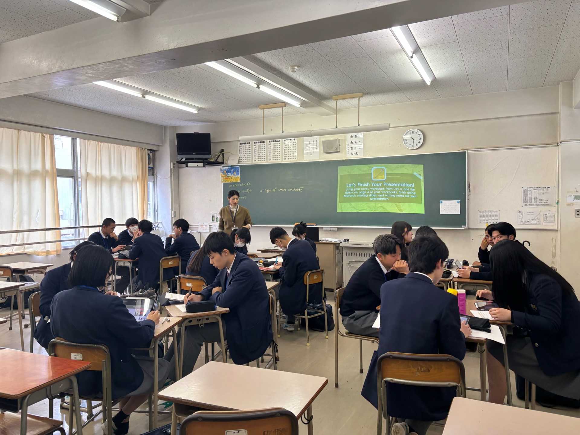 1、2日目は、来年度シンガポールへの海外研修旅行を実施するにあたり、機内やホテルといった場面、お土産を購入する場面などさまざまなシチュエーションを想定して英語のトレーニングを図りました。初めは緊張している様子もありましたが、徐々に積極的な姿勢も見られるようになり、英語が伝わった時の喜びも感じられたことと思います。 3、4日目は、日本の文化についてのプレゼン準備を進め、グループで発表を行いました。多くの人の前で発表をし、英語に対する自信を得られた生徒も多いようです。
