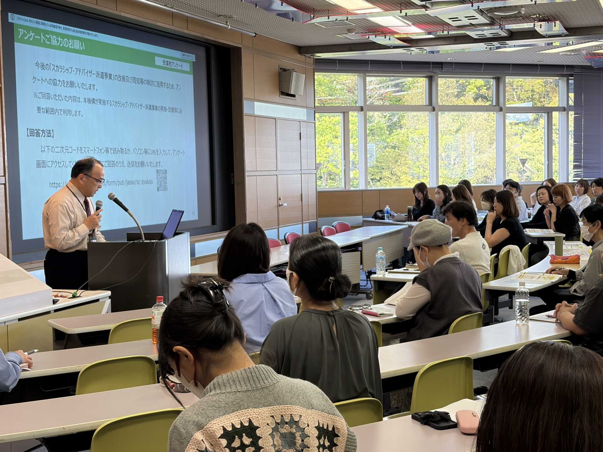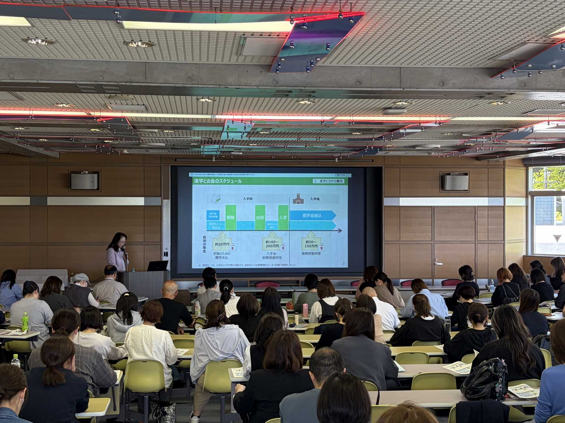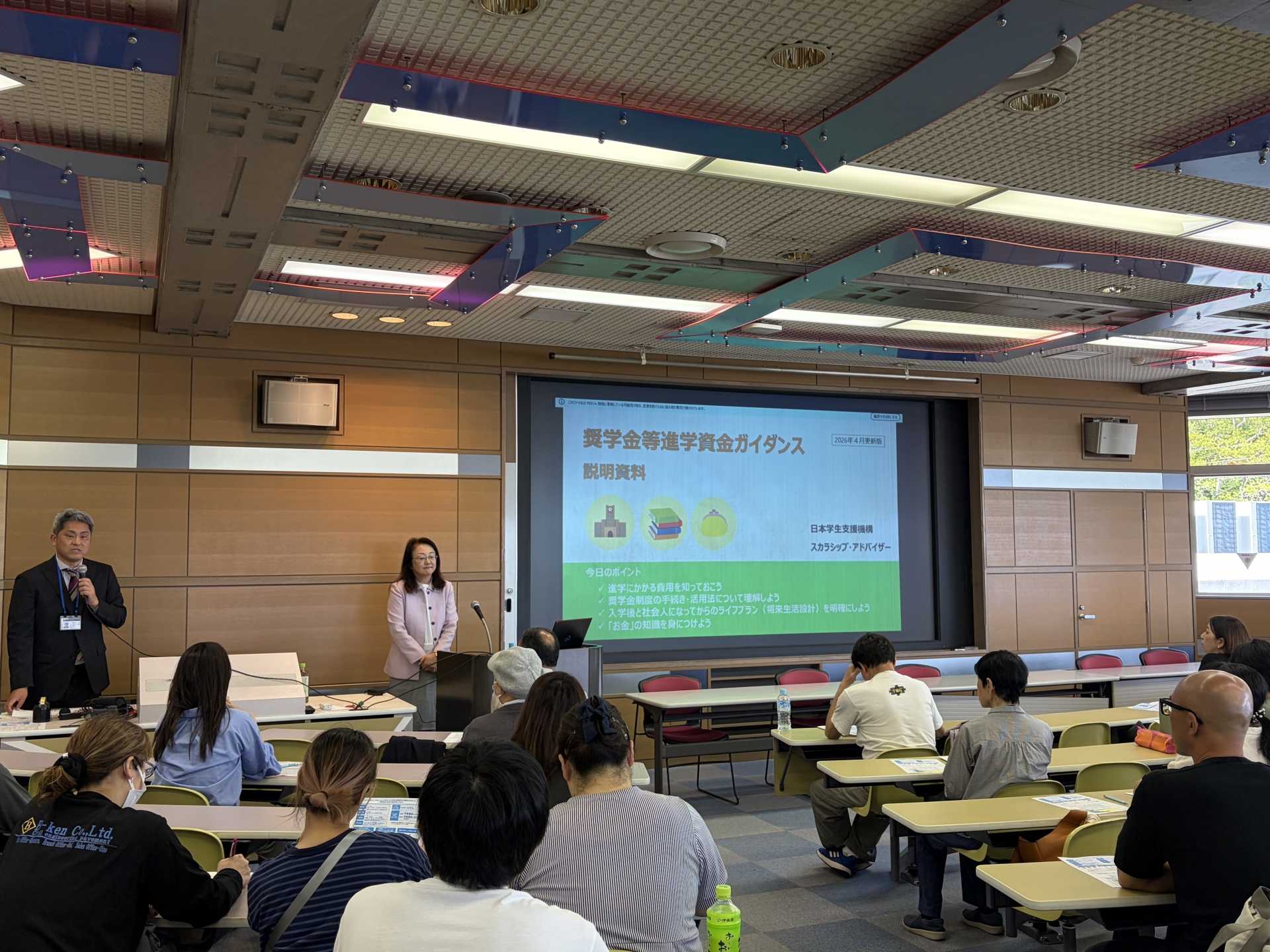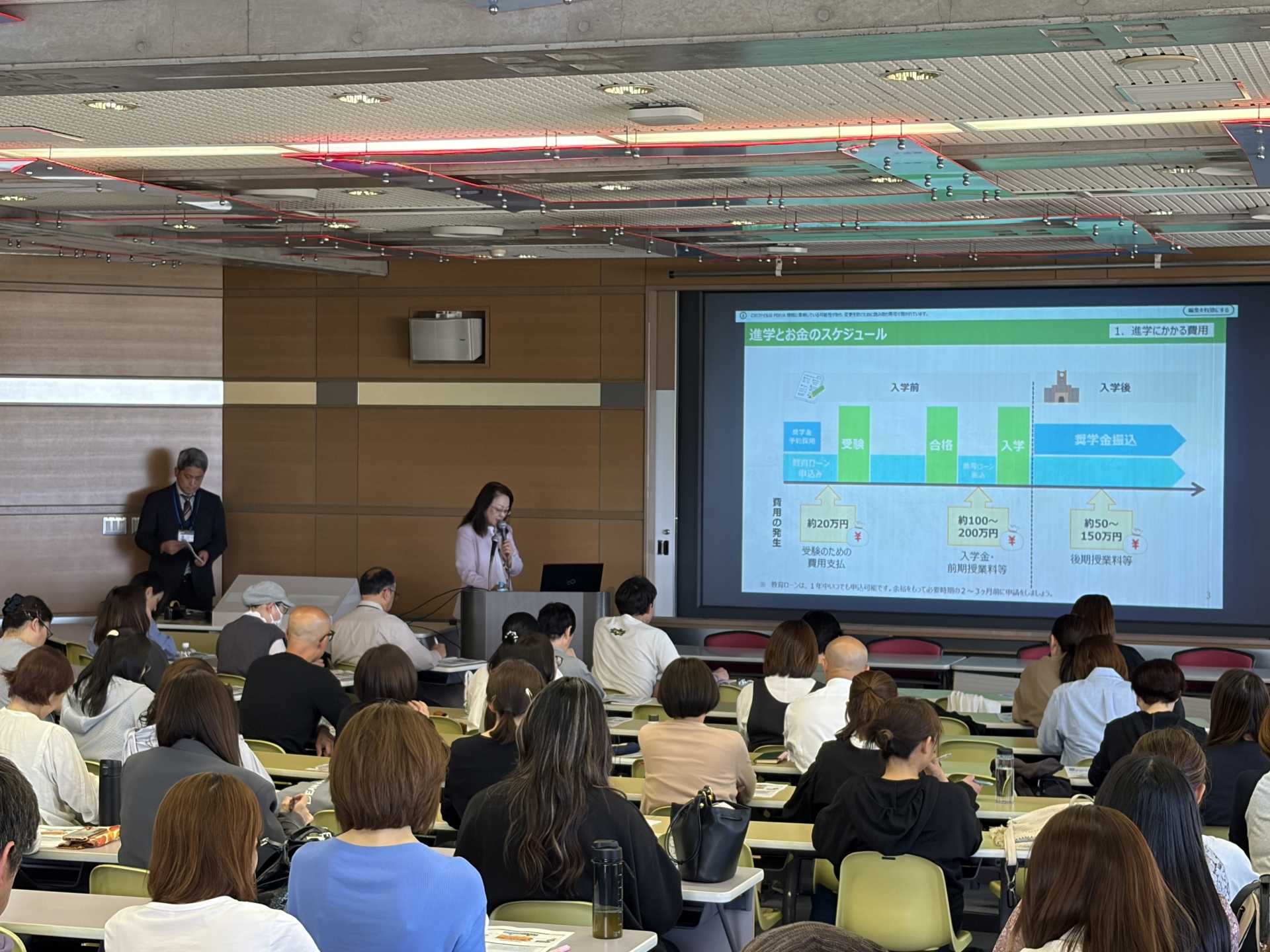 日本学生支援機構スカラシップ・アドバイザー森内東香さんを講師にお招きし、進学のお金のスケジュール、奨学金制度の仕組み、申し込みの基準、奨学金返還についてなど、1時間ほどで多岐にわたる説明をしていただきました。